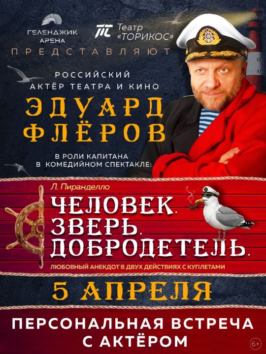 5 апреля известный артист театра и кино Эдуард Флёров, играющий роль Капитана дальнего плавания в яркой комедии театра ТОРИКОС «Человек, Зверь, Добродетель», встретится со счастливчиком-зрителем постановки. После спектакля победитель розыгрыша приглашается на ужин с актером в ресторан «Хороший год», расположенный на 2 этаже культурно-делового центра «Геленджик Арена», где в приятной атмосфере пройдет часовая встреча. Актер расскажет об интересных случаях на съемочной площадке, ответит на вопросы, а также сделает фото на память.